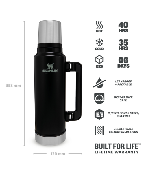 Classic Vacuum Bottle är en solid och klassisk termos. Den håller innehållet varmt i 40 timmar. Volymen är 1,4 liter.
