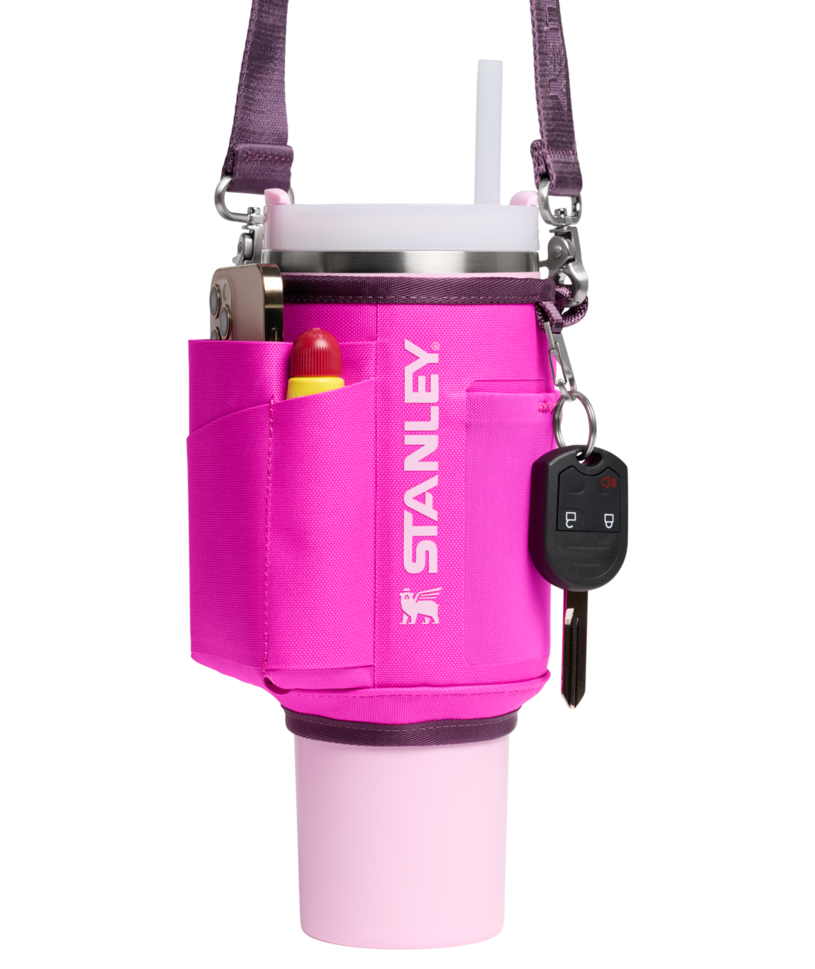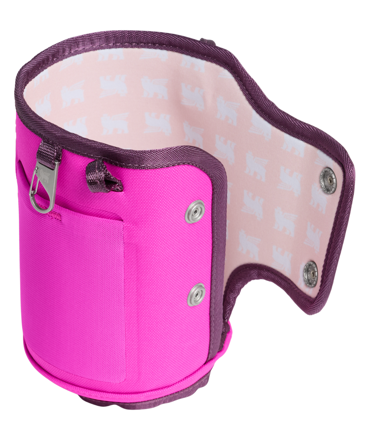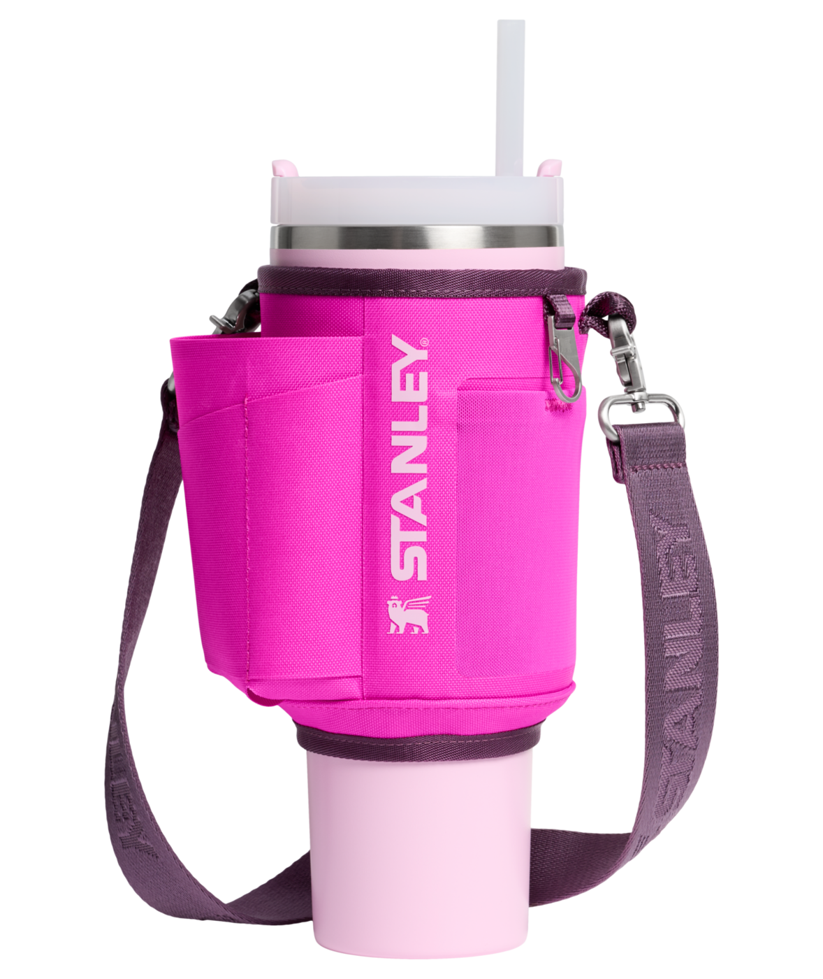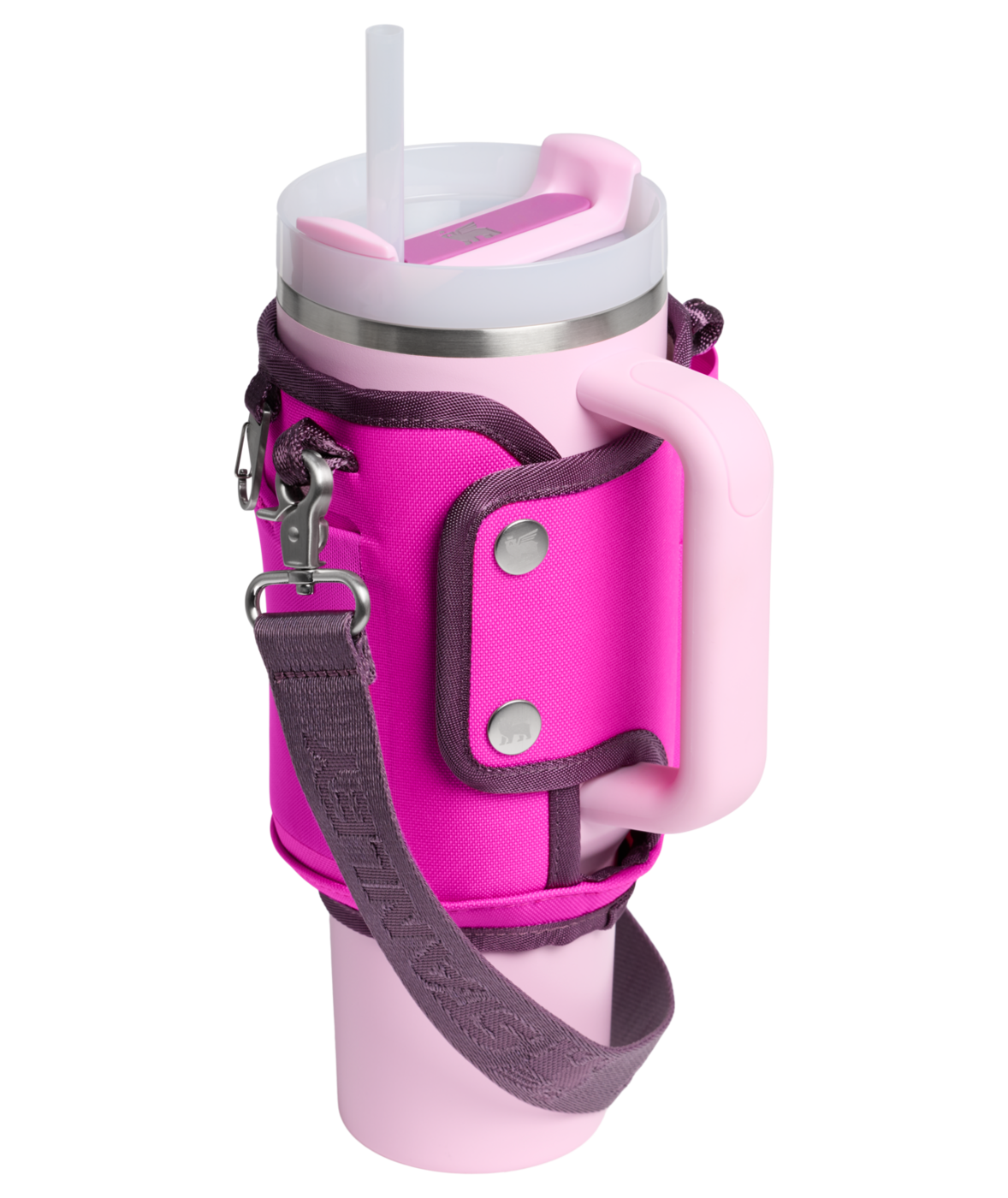 Fäst den justerbara remmen över kroppen och rör dig fritt med båda händerna fria. Den slitstarka remmen, fodrad med ett unikt winged bear-mönster, fästs säkert runt din 1.18L Quencher med ett dubbelt tryckknappslås.